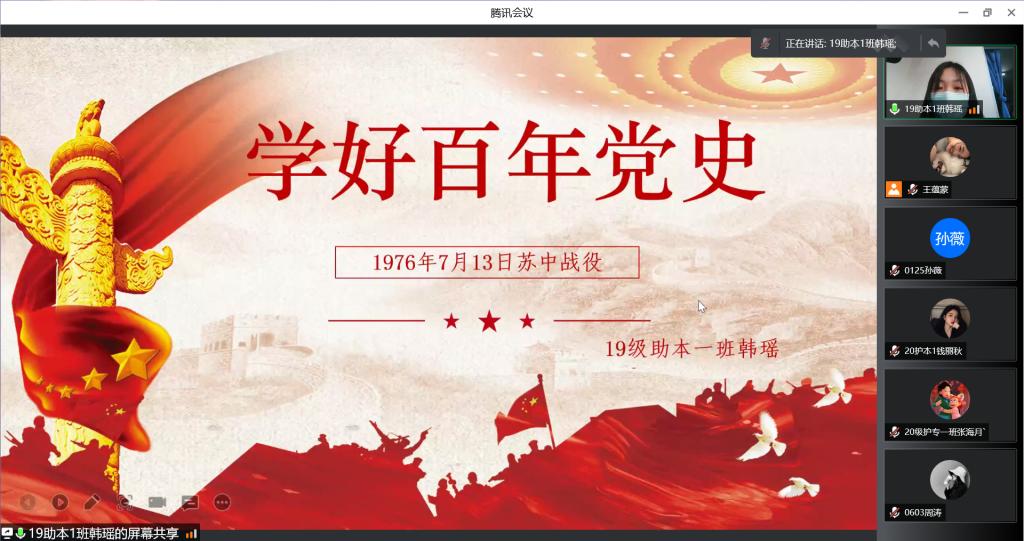 最后,韩瑶同学向我们讲述了苏中战役,她详细地阐述了战役的背景、过程、结果、影响四个要点,让我们见证了在这场大规模的战役中,虽处于兵力、装备劣势的先辈们却能采取正确的战役指导和灵活的战术原则,运用战略侦察优势,成功击败敌军。回望这段岁月,这艰难的一步,饱受风雨沧桑,让大家不禁感慨--党的伟大成就是一代代共产党人用艰苦奋斗换来的,伟大建党精神是无数革命先辈用鲜血和生命铸就的。