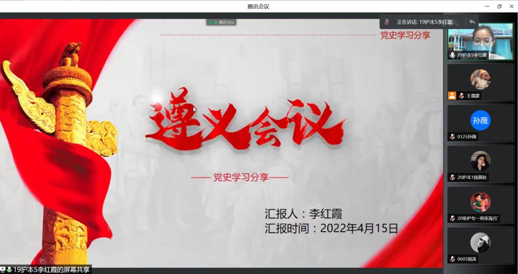 随后,李红霞同学介绍了著名的遵义会议,她讲解了会议的历史背景、内容、重大意义及精神。让我们看到老一辈革命家们为建党做出的巨大努力,这段岁月的回望使同学们真切感受到了中国共产党的建立之艰难,懂得了当代青少年在党和人民事业发展中的作用,激励着大家要坚持真理、坚守理想,深入学习贯彻习近平新时代中国特色社会主义思想,筑牢信仰之基,扣好人生的第一颗纽扣。