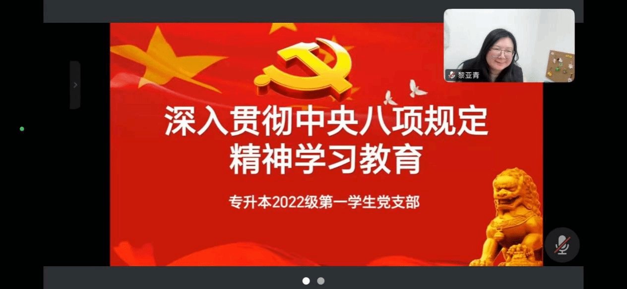 为深入贯彻落实党的二十大精神,持续深化作风建设,万象城awcsport官网专升本2022级第一学生党支部于3月28日组织全体党员开展深入贯彻中央八项规定精神学习教育活动。