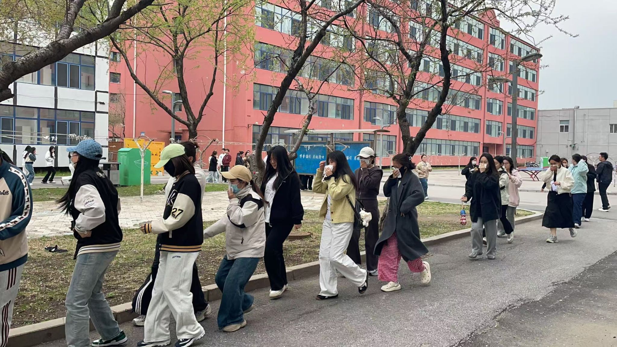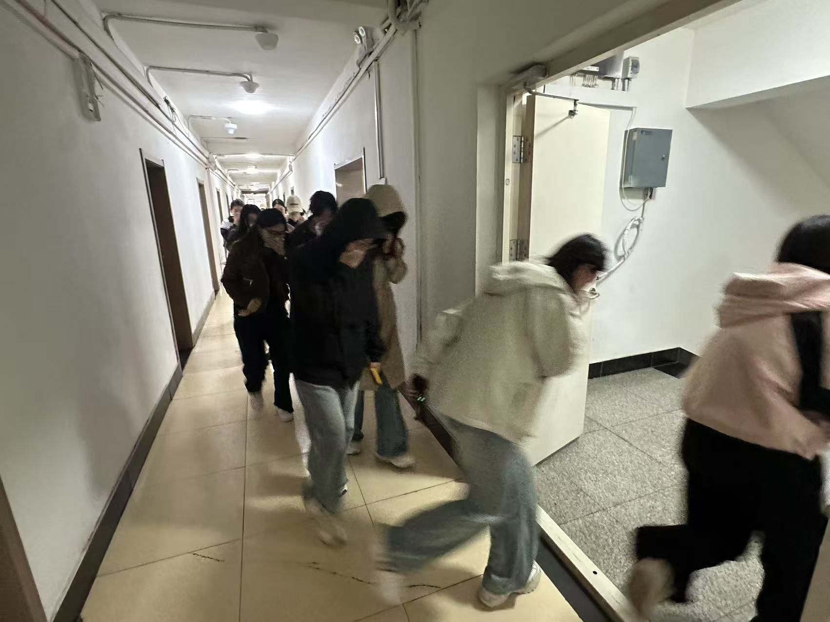 各楼层学生在辅导员和宿舍安全员的引导下,迅速用湿毛巾捂住口鼻,弯腰低姿,按照预定的疏散路线有序撤离。疏散过程中,大家保持冷静,不推搡、不拥挤,整个过程紧张而有序。2号楼学生从5层下楼,用时54秒;6号楼学生从2层下楼,用时38秒;7号楼学生从4层下楼,用时47秒。短短几十秒的时间,所有学生均安全撤离至宿舍区指定的安全集合点。