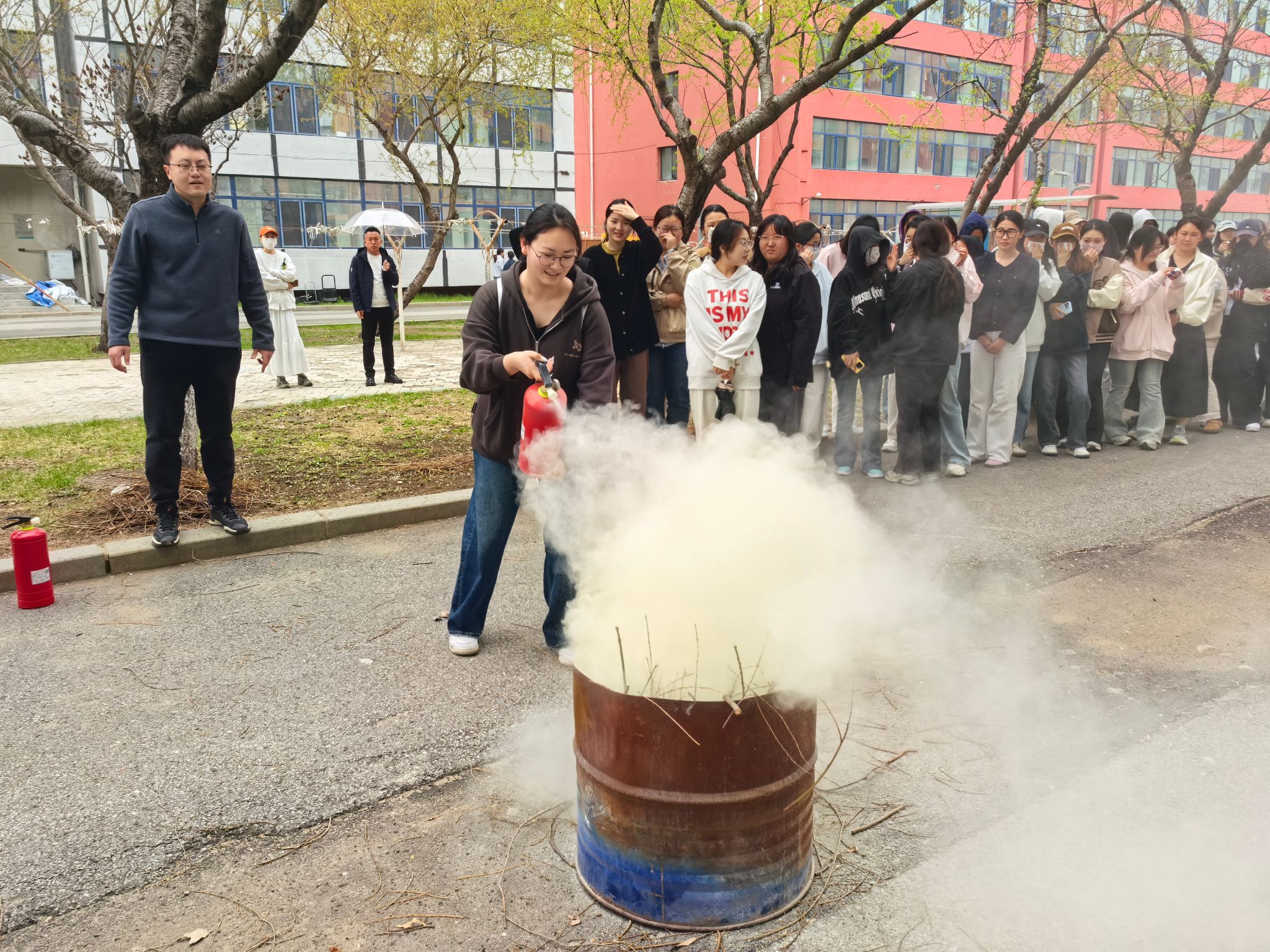 随后,同学们分组进行了灭火器实操演练。在孙斌老师的耐心指导下,大家纷纷拿起灭火器,按照正确的操作方法,对准模拟火源进行喷射。一开始,部分同学由于紧张,操作不够熟练,但在消防人员的鼓励和纠正下,很快掌握了技巧,成功将火扑灭。通过亲身体验,同学们不仅熟悉了灭火器的使用方法,还增强了应对火灾的信心和能力。