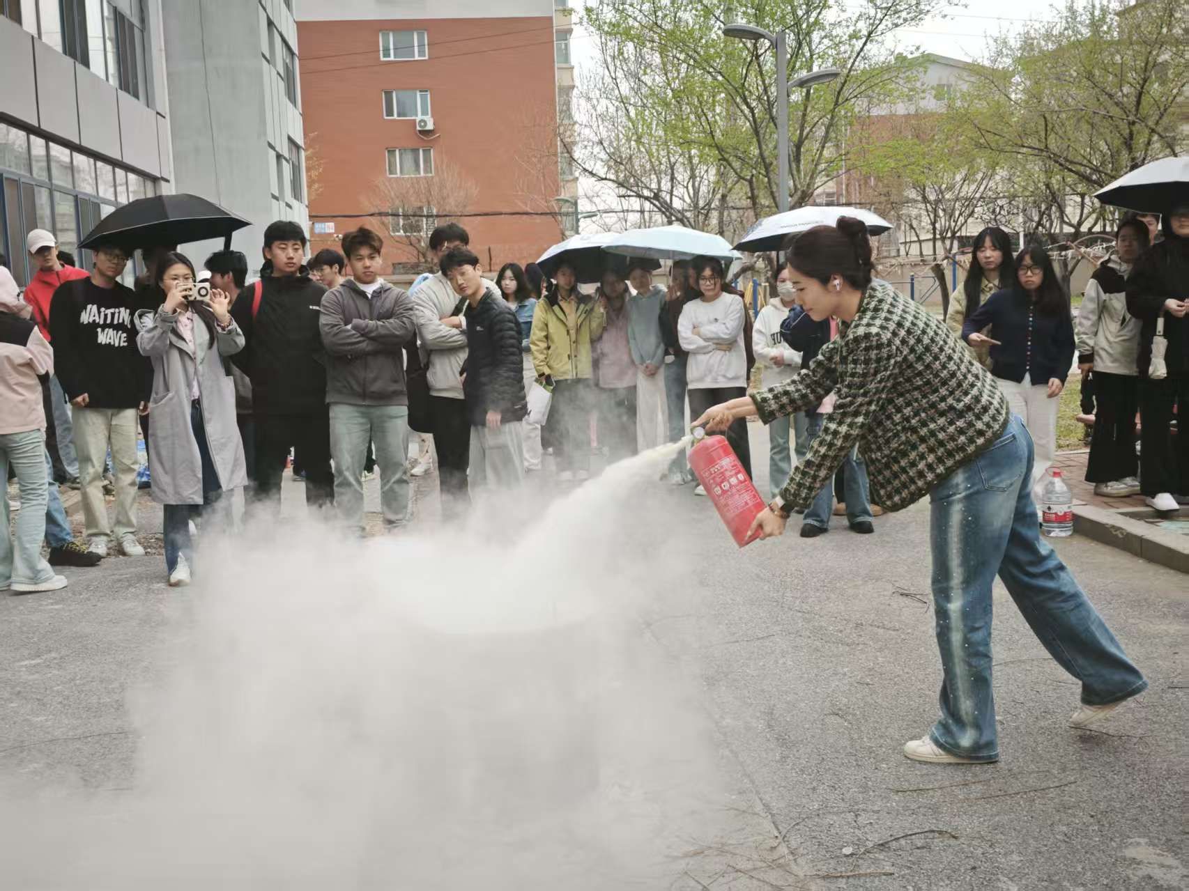 在理论讲解的基础上同学们进行了现场示范。他们手持灭火器,一边操作一边讲解:“使用灭火器时,要牢记‘提、拔、握、压’四字口诀。首先提起灭火器,然后拔掉保险销,接着握住喷管,最后用力压下压把,对准火焰根部进行喷射。”示范动作熟练、规范,让同学们对灭火器的使用有了更直观的认识。