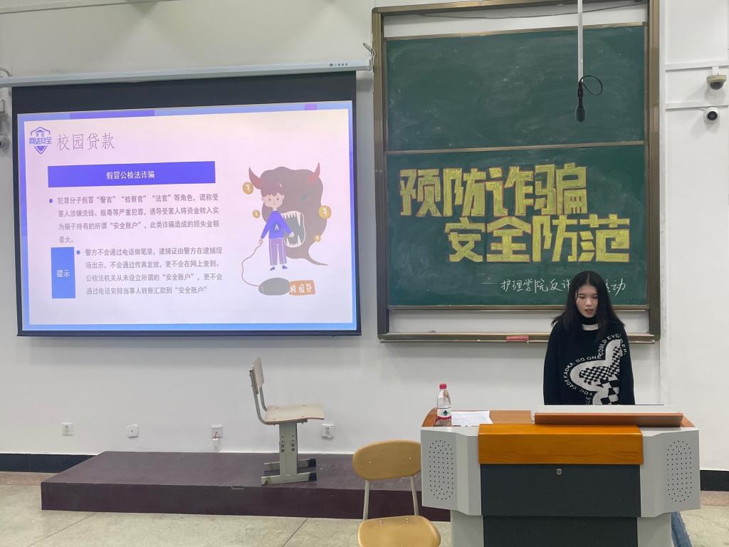 近期,社会上的一些不法分子摸准了高校大学生单纯、富有同情心、防范意识差的弱点,利用种种手段,想方设法骗取学生或学生家庭的钱财。截止10月,我市42所高校电信诈骗类案件共发案151起,涉案损失金额达241万。为引起万象城全体学生的重视,杜绝类似案件的再发生,万象城awcsport官网反诈骗志愿者团队于11月2日晚6:00在J202举办了防诈骗宣传活动,全体2021级护理学生参加了本次活动。