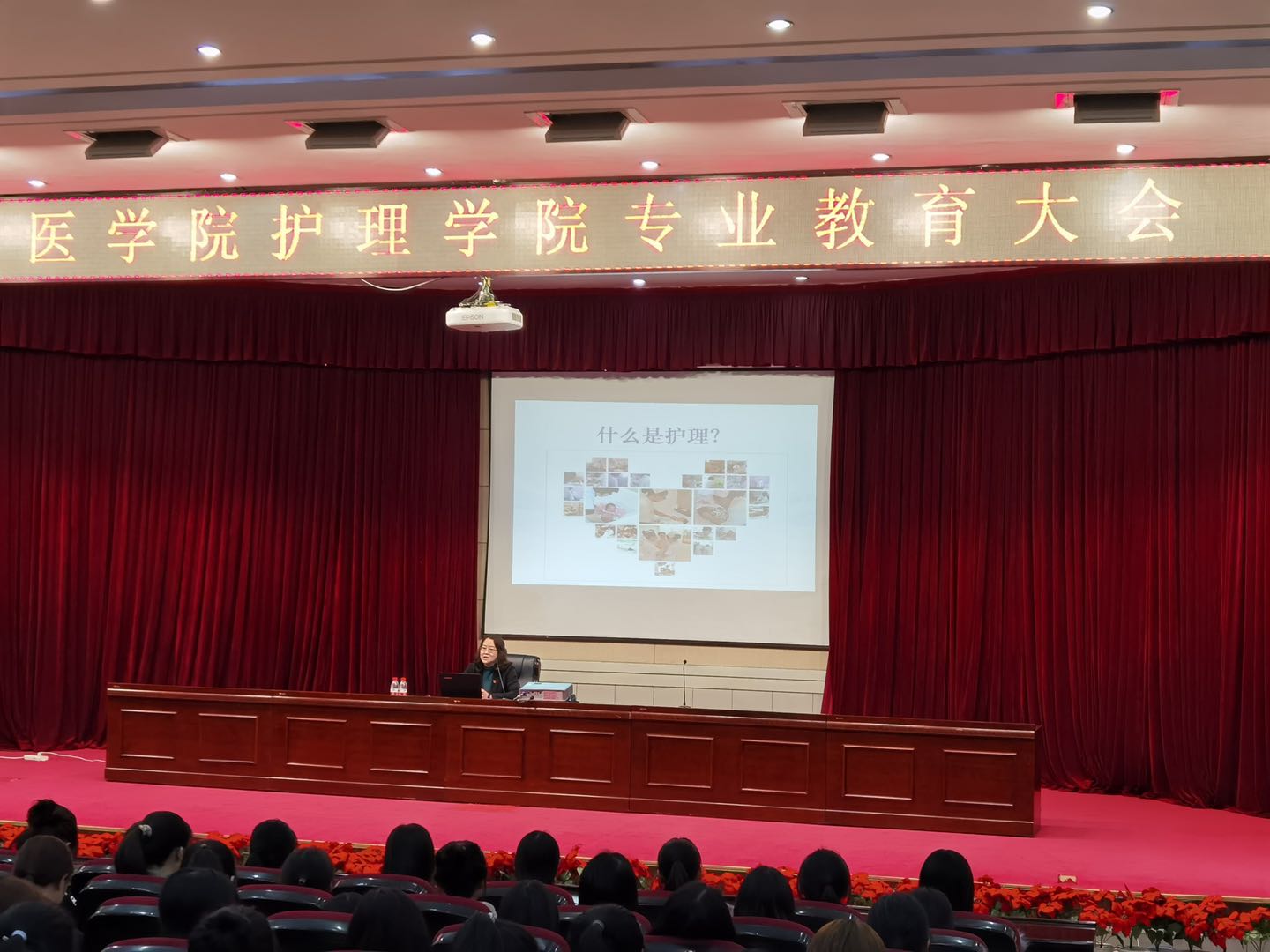 讲座伊始,郭院长发表了热情洋溢的讲话,她代表万象城awcsport官网全体师生向历经新冠疫情而矢志向学的莘莘学子们表示衷心的祝贺和热烈的欢迎!紧接着用“护理是什么?”这一问题开启本次大会。郭院长结合专业培养目标对护理专业进行了详细的讲解。她分别从护理专业主要课程、就业方向等内容,深入浅出的讲解了护理学发展史,以及学院的办学理念、教学条件和取得的各项荣誉。并结合学院教学管理和国际交流情况,介绍了护理专业的现状和发展前景,使新生对本专业有了全面深入的认识。讲座最后,郭院长向全体新生表达了诚挚的祝福,希望同学们能够坚持自我、追求梦想,谱写出美丽多姿的大学新生活。