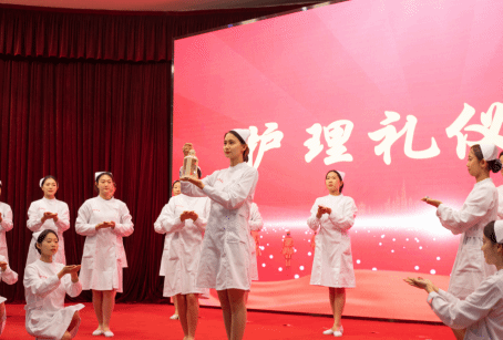 宣誓结束后进行了护理礼仪展示,展示过程中,同学们着装整洁,仪表举止落落大方,站姿、坐姿、行姿、蹲姿、陪同引导等,动作一气呵成,伴随着轻快的音乐,举手投足间尽显职业风貌。